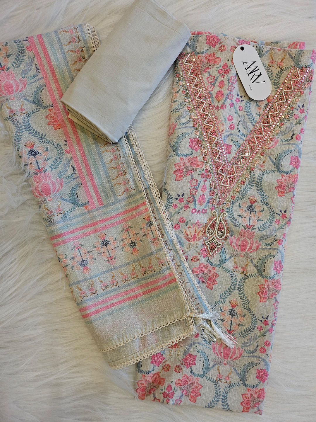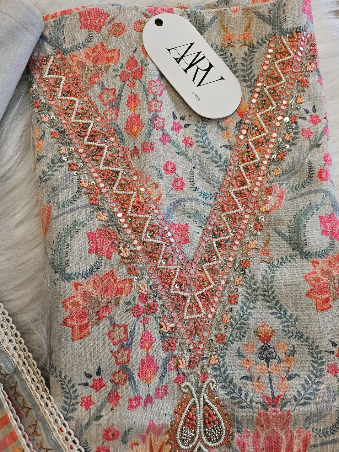 Organic cotton print with neck hand embroidery , cotton bottom , mul cotton printed dupatta with 2 side lace.